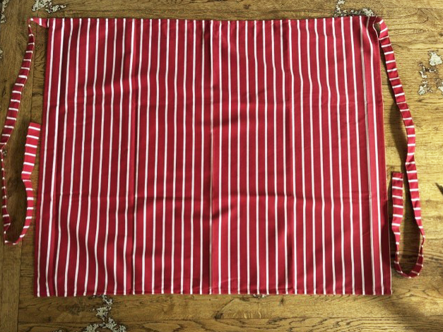 3/4 Red And White Long Waist Apron no pockets, Double stitched generous waist ties, made from same fabric as apron, for greater strength and durability.